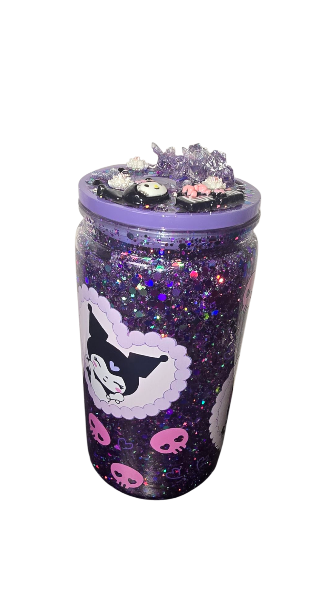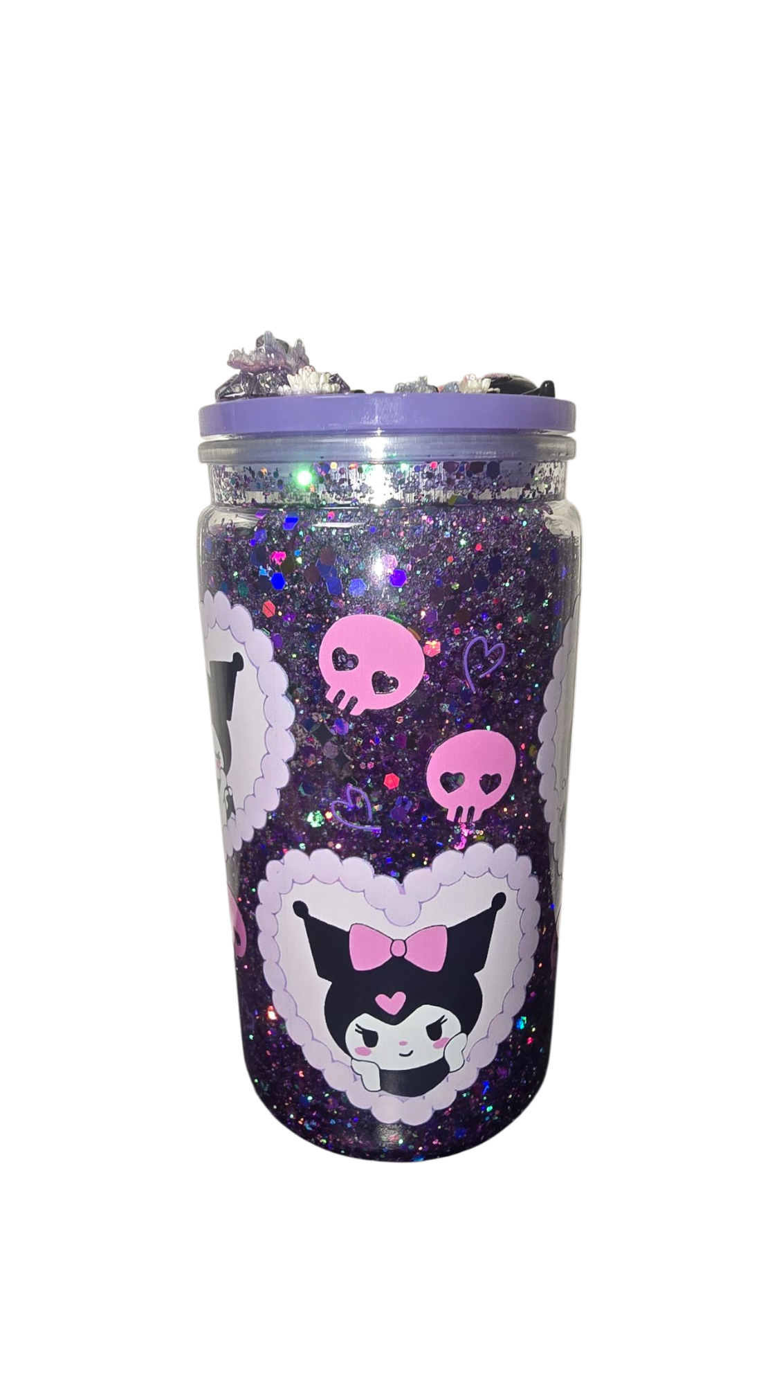 Enjoy your favorite drinks in style with this playful 16oz Kuromi snow globe cup. Featuring a custom lid, it’s perfect for keeping your beverages secure while showcasing the charming Kuromi design. Ready to ship and sure to brighten your day with every sip!